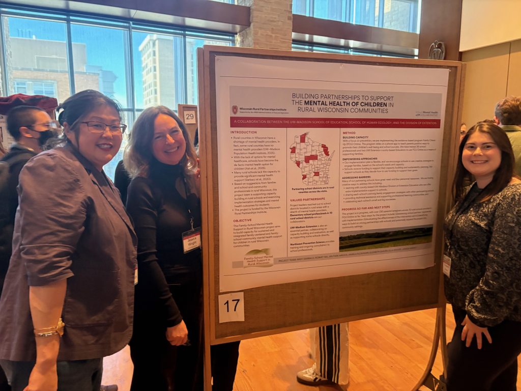 Jen Park-Mroch (Division of Extension, Health and Well-Being Institute), Jessica Wright (Wisconsin Center for Education Research) and Elizabeth Shaver (Wisconsin Center for Education Research) stand in front of their poster.